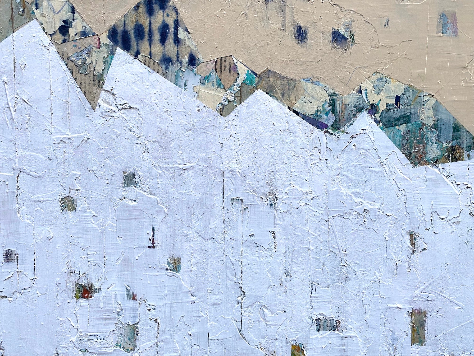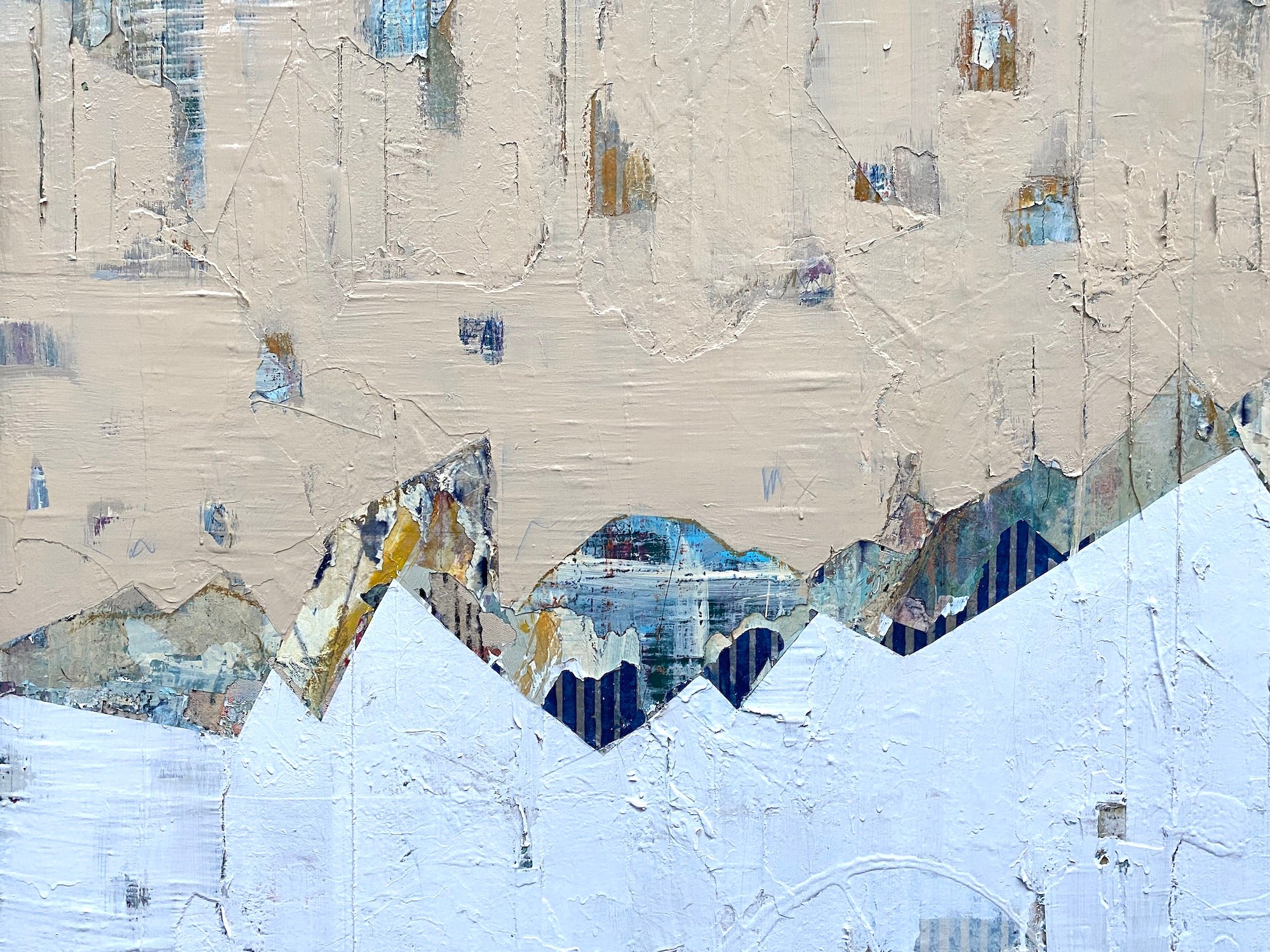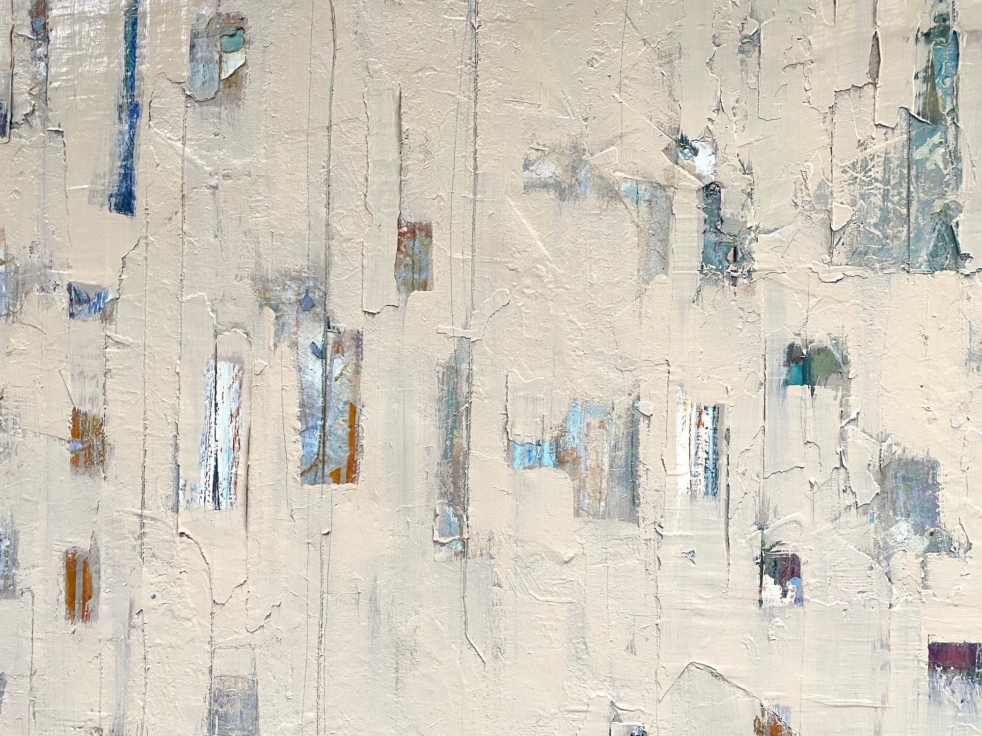 Original one of a kind hand created mixed media artwork on 72x 60x 1.5" gallery wrapped canvas. Thick textures combine with specialty Thai marble and Nepalese Lokta papers making up this statement piece. Finished with a final layer of protective varnish and all sides are painted satin black so a frame is not necessary.